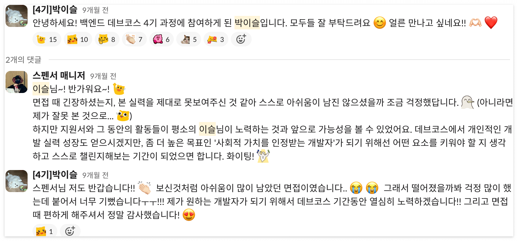 데브코스를 처음 들어갔을 때와 지금의 나는 완전히 다르다. 그때는 취업 준비로 인해 자신감이 많이 떨어져 있었고, 무엇을 하든 어설펐다. 하지만 데브코스에 합격하면서 '데브코스가 나에게 남은 마지막 희망이다. 최선을 다하자'라는 결심을 하게 되었다.