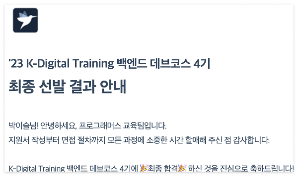 그러나 공부를 할수록 나의 부족함이 더욱 실감나고, 취업 가능성에 대한 두려움이 커졌다. 혼자서 공부하는 것으로는 원하는 곳에 취업하기 어렵다는 결정을 내리고, 코딩 부트캠프를 찾기 시작했다. 여러 부트캠프를 조사하고 후기를 찾아보며 두 곳을 지원했다. 데브코스와 xx였다. 데브코스를 가장 하고 싶었는데, 다행히 데브코스에서 먼저 최종 합격 소식을 받았다. 이후에 있었던 xx 면접은 보지 않고 데브코스를 선택했다.