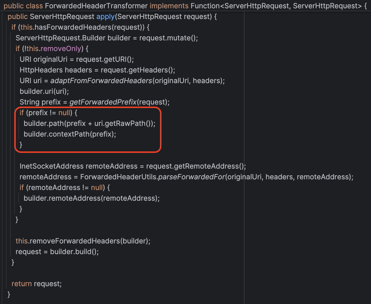 이 클래스의 코드에서 빨간 네모로 표시된 부분을 보면, prefix 값을 기반으로 요청 경로를 재작성하는 로직이 포함되어 있습니다.