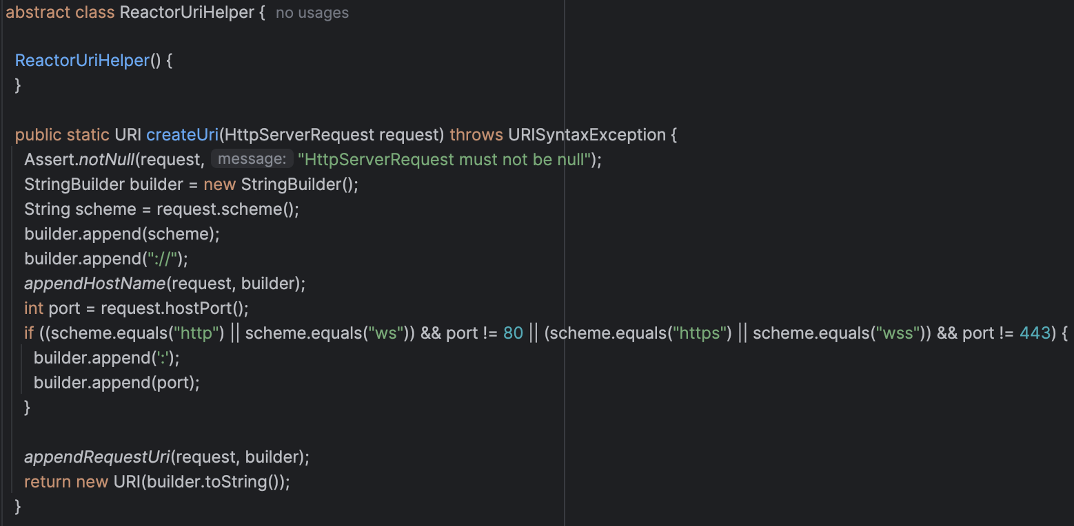 NATIVE로 설정되었을 때, 포워드 헤더에 따른 경로가 재작성 되었으며 디버깅 끝에 경로가 재작성되는 클래스를 발견했는데, 바로 ReactorUriHelper였습니다. 여기서 X-Forwarded-Prefix 값을 경로에 추가하는 로직이 포함되어 있습니다.